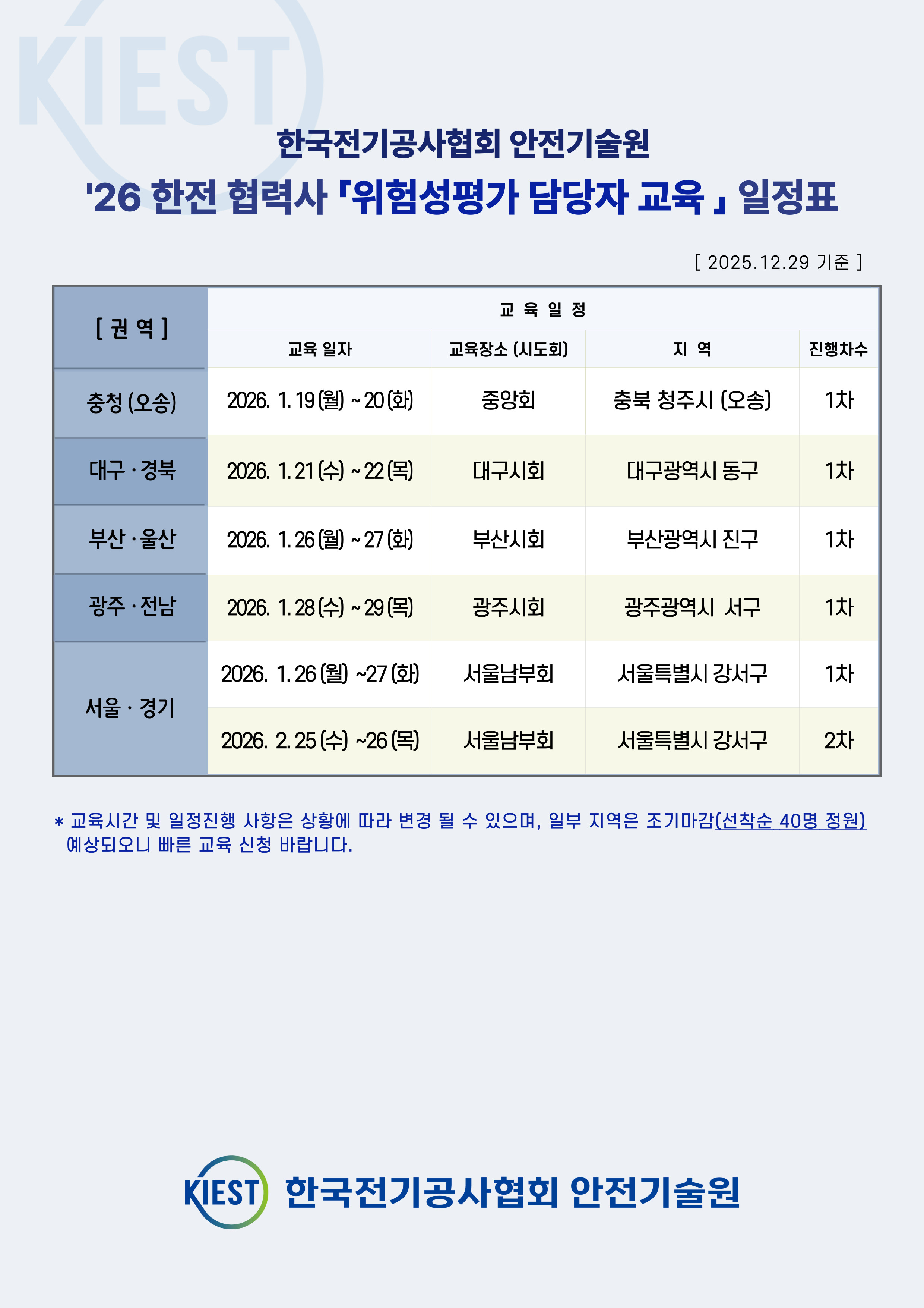 ※ 2026년 상반기 위험성평가 담당자 교육 접수 ▶ 교육 신청 교육과정의 신청은 이메일 접수(edu@kiest.co.kr) 방법으로 받고있습니다. 첨부파일 (신청서) 을 확인하시어, 일정별 접수 바랍니다. ▶ 교육 신청 시 교육신청서(직인 또는 서명 필수)와 사업자등록증을 함께 첨부 ▶ 매 차수별 40명 정원으로 선착순 마감 ![]() ![]() ☞ 교육 신청 ● 교육 신청 시 교육신청서(직인 또는 서명 필수)와 사업자등록증 보내주시기 바랍니다. ● 교육 일정 3일전 마감(신청 불가능)이오니 참고해주시기 바랍니다. ☞ 교육 장소 및 일정 안내문자 발송 ● 교육 일정 3일 전 마감 후 참석자 개별 안내문자 발송 ☞ 교육비 정산(후불) ● 교육신청서에 기재해 주신 이메일 및 사업자등록번호로 세금계산서를 발행(교육 종료일 기준)하오니 교육수료 후 입금하여 주시기 바랍니다. ● 교육 종료 후, [안전기술원]세금계산서 발행 → [교육이수자]교육비 입금 ● 교육비 입금계좌: 695-027966-04-017 IBK기업은행 / 세금계산서 '비고'란에 입금계좌 기재해드리오니 참고하시기 바랍니다. |
